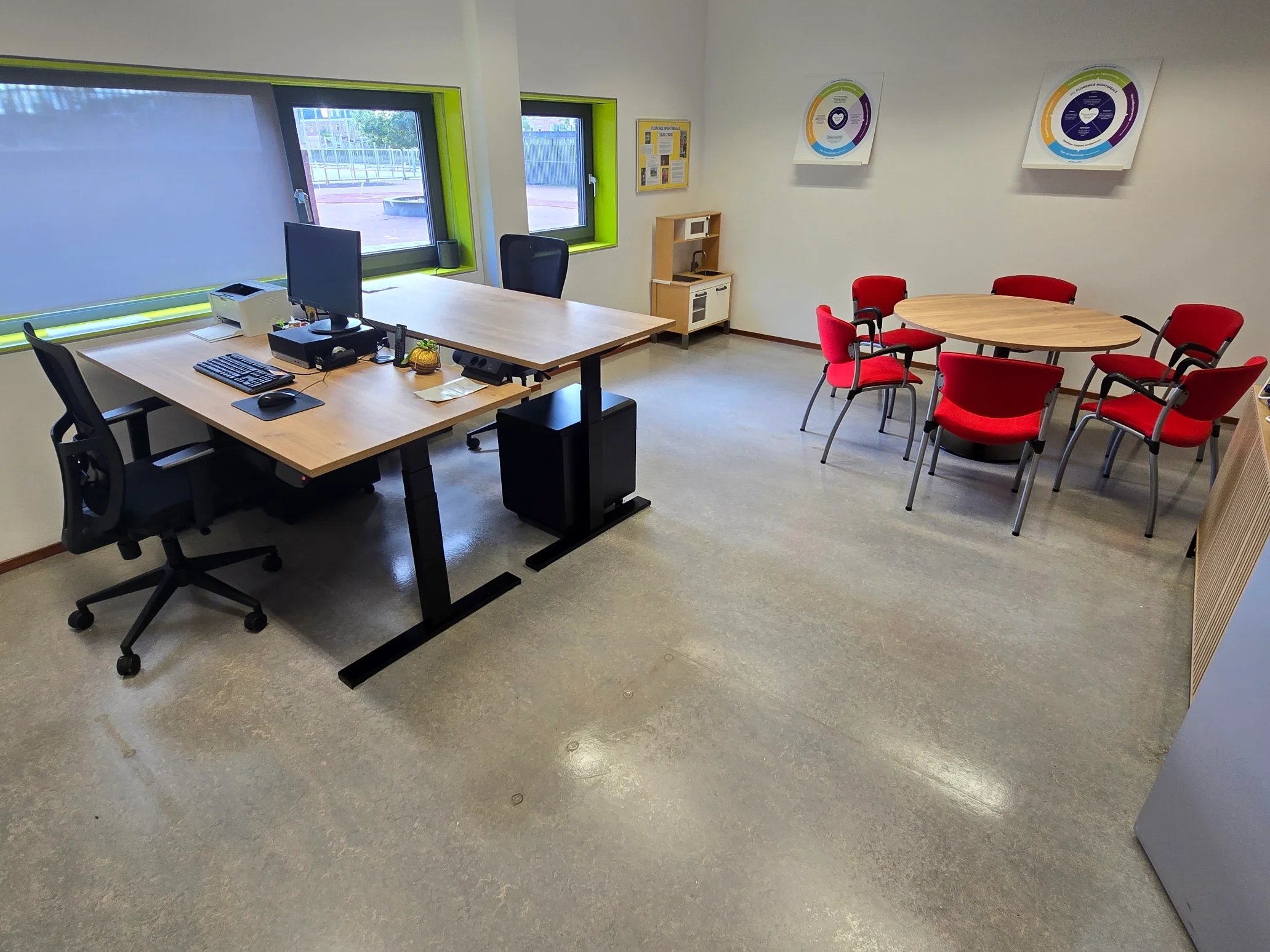 De school had behoefte aan nieuwe werkplekken voor het team. Niet alleen functioneel, maar ook netjes afgewerkt en veilig geplaatst, zonder dat het dagelijkse onderwijsproces daaronder zou lijden.